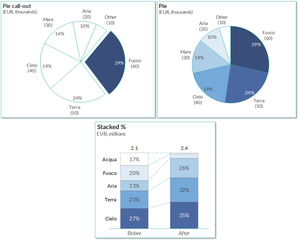 The labels of the 100 chart support the label content property which lets you choose if you want to display absolute values percentages or both label contentwith think cell you can create 100 charts with columns that do not necessarily add up to 100.
